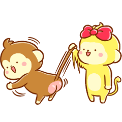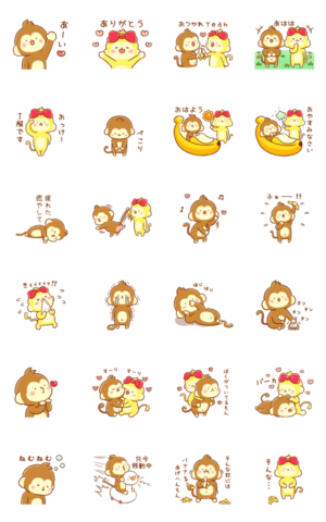 おかげさまで第6弾!仲良しモンキーカップル、もんちゃんときぃちゃんの楽しく動くおサルさんスタンプ♪大切なあの人とのトークのお供に。ぷっち より発売