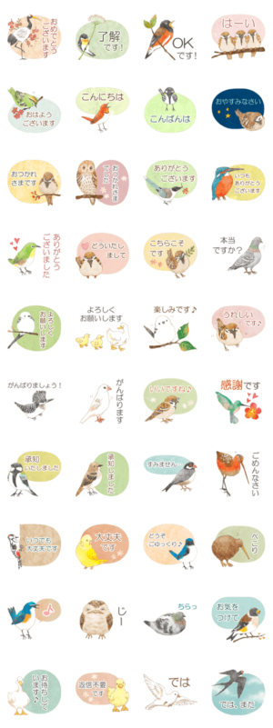 小鳥から大きめの鳥まで40羽の、手書きスタンプです。よく使う敬語を添えました。パステルカラーとほどよいリアルさが可愛い、大人も使いやすい落ち着いたスタンプです。