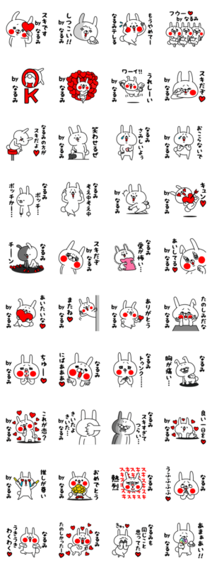うぇーいうさぎの全力スタンプ第12弾!!全力でうざい全力でおちょくる「ナルミ」専用名前スタンプ。かわいいウサギで使いやすいデカ文字タイプ。ラヴ編。愛の告白に。