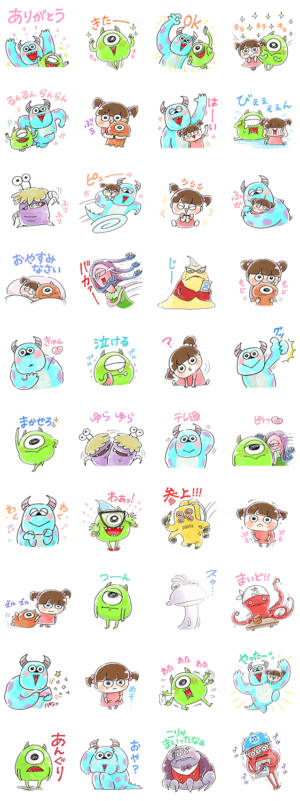 人気クリエイターMOGU描き下ろしのモンスターズ・インクのスタンプ登場!サリーやマイク、ブーたちのゆる~く可愛いほのぼのした姿に癒されます♪