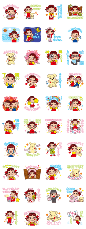 不二家の人気キャラクター「ペコちゃん」の丁寧でかわいいスタンプだよ♪挨拶やお返事を元気に楽しく送ります!
