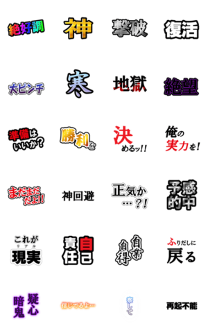 様々な状況で使えるデカ文字のアニメーションスタンプ。激アツから絶望まで楽しい動きでメッセージを伝えます。