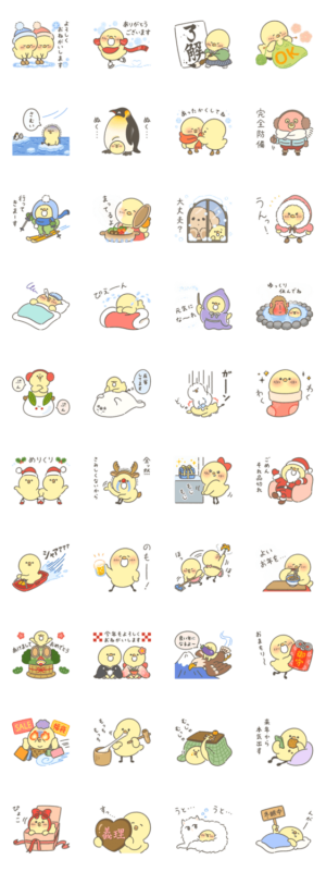 冬を感じるひよこたちのスタンプです。日常会話や冬イベント(クリスマス/忘年会/新年会/年末年始/お正月/年賀状/福袋/受験/合格祈願/バレンタイン)等、毎日使いやすい♪SEICA より発売