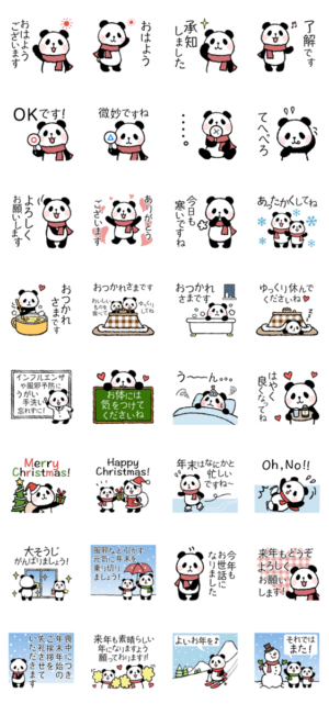 ほのぼのとしたゆるーいパンダの冬、年末のイベントに使えるスタンプです。寒い冬も暖かく過ごされますように!ginger より発売