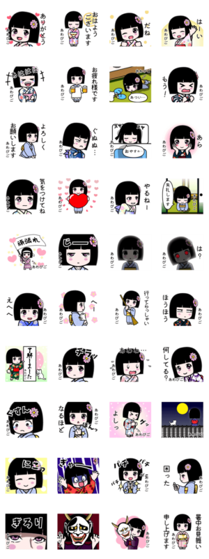 『あわびご』用のよく使う言葉を詰め合わせた座敷童子のスタンプです。和服 着物 浴衣かがりひな より発売